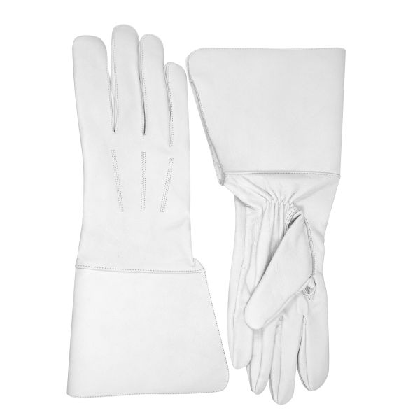 Drum major gauntlets made from white leather are often used as part of a drum major’s uniform in marching bands and similar ensembles.