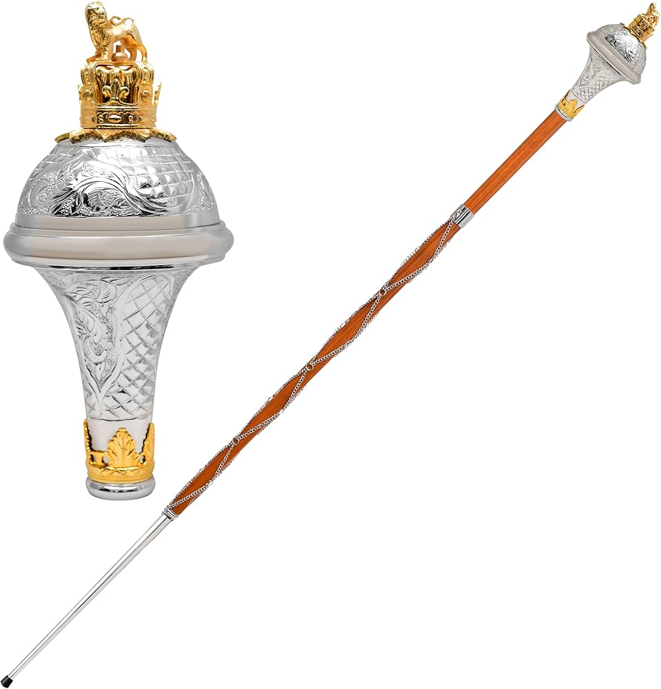 Crown & Finial: Finished with a gold-colored crown topped with a rampant lion finial, creating a commanding and authoritative look.